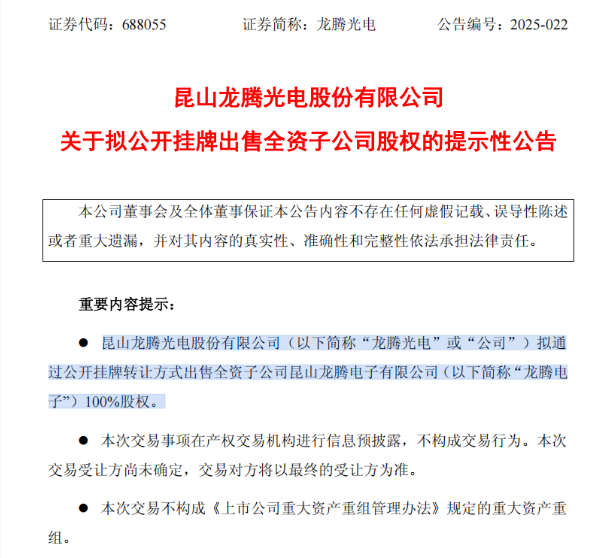 龙腾光电11月4日公告,因应公司全球战略发展规划,优化资源配置并推进新质生产力领域布局,提高整体运营效率,公司拟通过公开挂牌转让方式出售全资子公司龙腾电子100%股权。