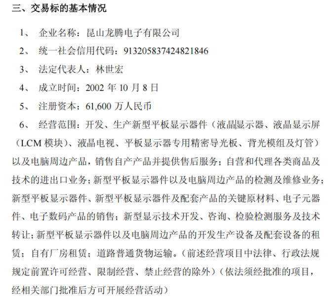 龙腾光电表示,本次交易事项在产权交易机构进行信息预披露,不构成交易行为,交易对方、交易方式、交易价格等相关事项目前尚不确定。