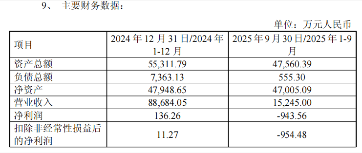 公告显示,标的公司注册资本6.16亿人民币,2024年末资产总额5.53亿、净资产4.79亿,营业收入8.87亿,净利润136.26万;2025年9月末资产总额4.76亿、净资产4.7亿,净利润-943.56万。