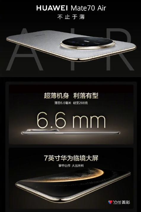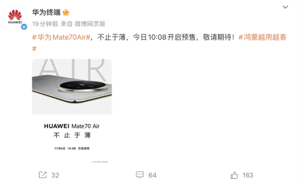 11月6日,华为宣布,Mate70 Air将于今日10:08正式开启预售,售价4199元起,拥有曜金黑、羽衣白、金丝银锦三款配色。官方定义“不止于薄”。