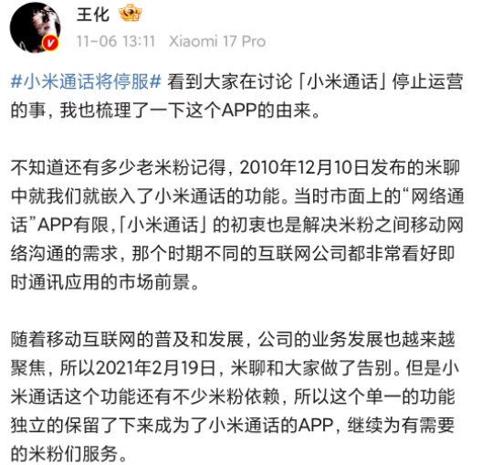 对此,11月6日,小米公关负责人王化发文回应“小米通话停止服务”一事。
