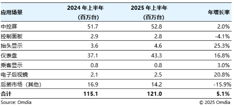 11月6日消息,市场调研机构Omdia发布最新报告,2025年上半年全球汽车显示市场出货量达到1.2096亿台,同比增长5.1%。
