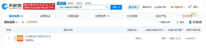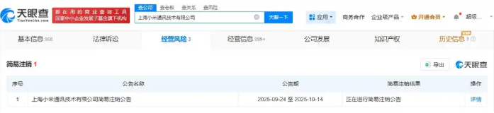 天眼查工商信息显示,近日,上海小米通讯技术有限公司登记状态由存续变更为注销。此前,该公司已发布简易注销公告。该公司成立于2022年8月,法定代表人为曾学忠,注册资本500万元人民币,经营范围包括软件开发、信息技术咨询服务、信息系统集成服务、计算机软硬件及辅助设备零售等。股东信息显示,该公司由小米通讯技术有限公司全资持股。
