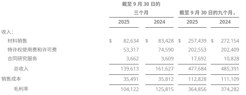 财报显示,UDC第三季度实现营收1.396亿美元,其中显示材料销售收入为8,263.4万美元;特许权使用费和许可费业务收入为5,331.7万美元;合同研究服务业务收入为366.2万美元。此外,公司三季度毛利润为1.041亿美元,整体毛利率高达75%。
