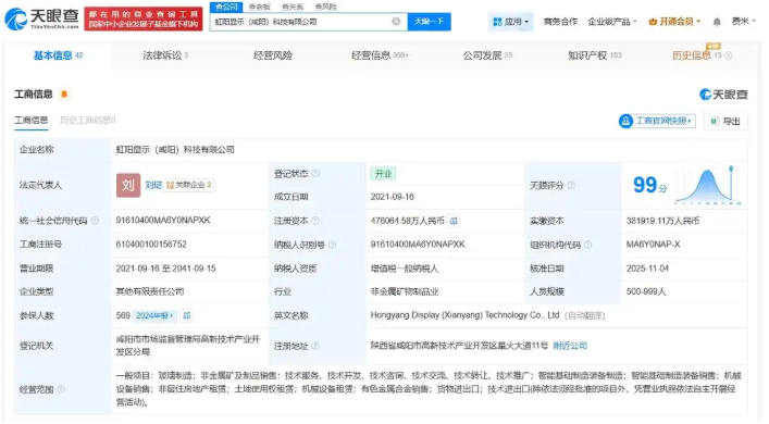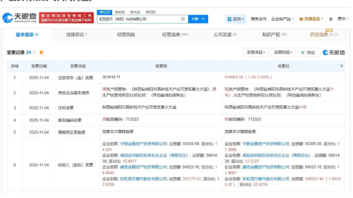 天眼查、爱企查工商信息显示,近日,虹阳显示(咸阳)科技有限公司(以下简称:虹阳显示)发生工商变更,注册资本由约38.2亿元人民币增至约47.8亿元人民币,增幅约25%。
