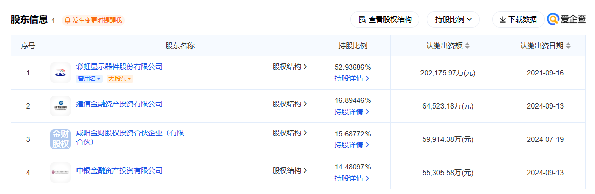 虹阳显示成立于2021年9月,法定代表人为刘琎,经营范围包括玻璃制造、非金属矿及制品销售、智能基础制造装备制造等。股东信息显示,该公司由彩虹股份(600707)、建信金融资产投资有限公司、咸阳金财股权投资合伙企业(有限合伙)、中银金融资产投资有限公司共同持股。