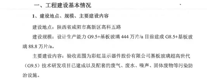 据寻标宝网站显示,2025年8月15日,运营公司虹阳显示依据《建设项目竣工环境保护验收暂行办法》和国家有关法律法规、建设项目竣工环境保护验收技术指南、本项目环境影响报告表和批复等要求,在咸阳市高新区召开了《彩虹显示器件股份有限公司基板玻璃超高世代(G9.5)技术研发项目》(阶段性)竣工环境保护验收会。
