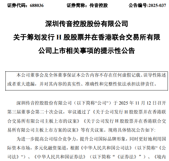 公告显示,传音控股于2025年11月12日召开第三届董事会第二十次会议,会议审议通过了关于发行H股股票并在香港联合交易所有限公司主板上市的相关议案。