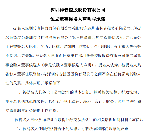 11月12日晚间,传音控股发布公告称,公司董事会同意提名黄绮汶女士为公司第三届董事会独立董事候选人。