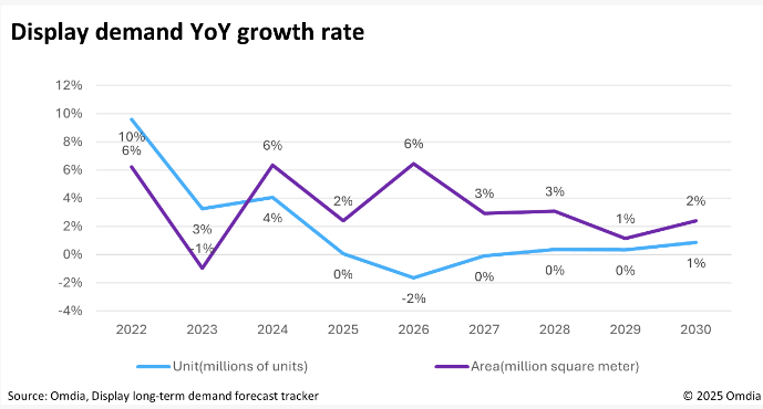 Omdia表示,虽然受美国进口关税政策不确定性和经济增速放缓影响,显示面板出货量预计将下降2%,但在大尺寸显示面板需求增长的推动下,整体面积需求仍将保持强劲。Omdia预计,由于美国进口关税政策引发的供应链变化,以及消费需求疲软,2025年显示面板市场的面积需求仅增长2%,增速低于2024年。