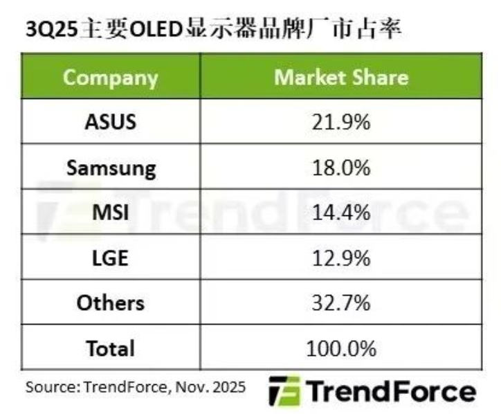 TrendForce集邦咨询表示,第三季OLED显示器出货前两名顺序翻转,华硕市占率上升至21.9%,首度拿下OLED显示器单季出货第一名。